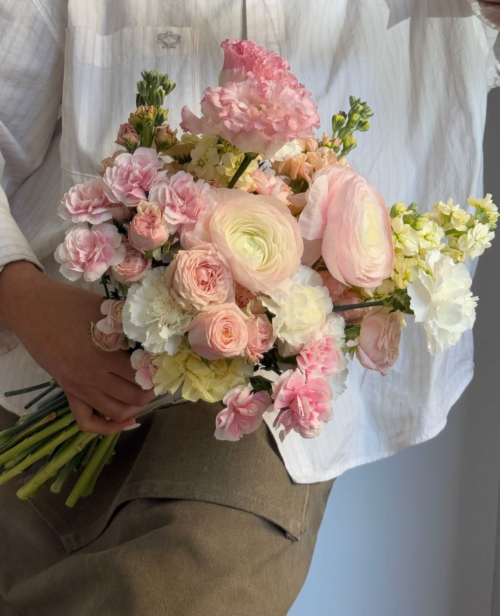 Enthält: Eustoma, Sprayrose, Nelken, Matthiola, Spraynelken und Ranunkeln.